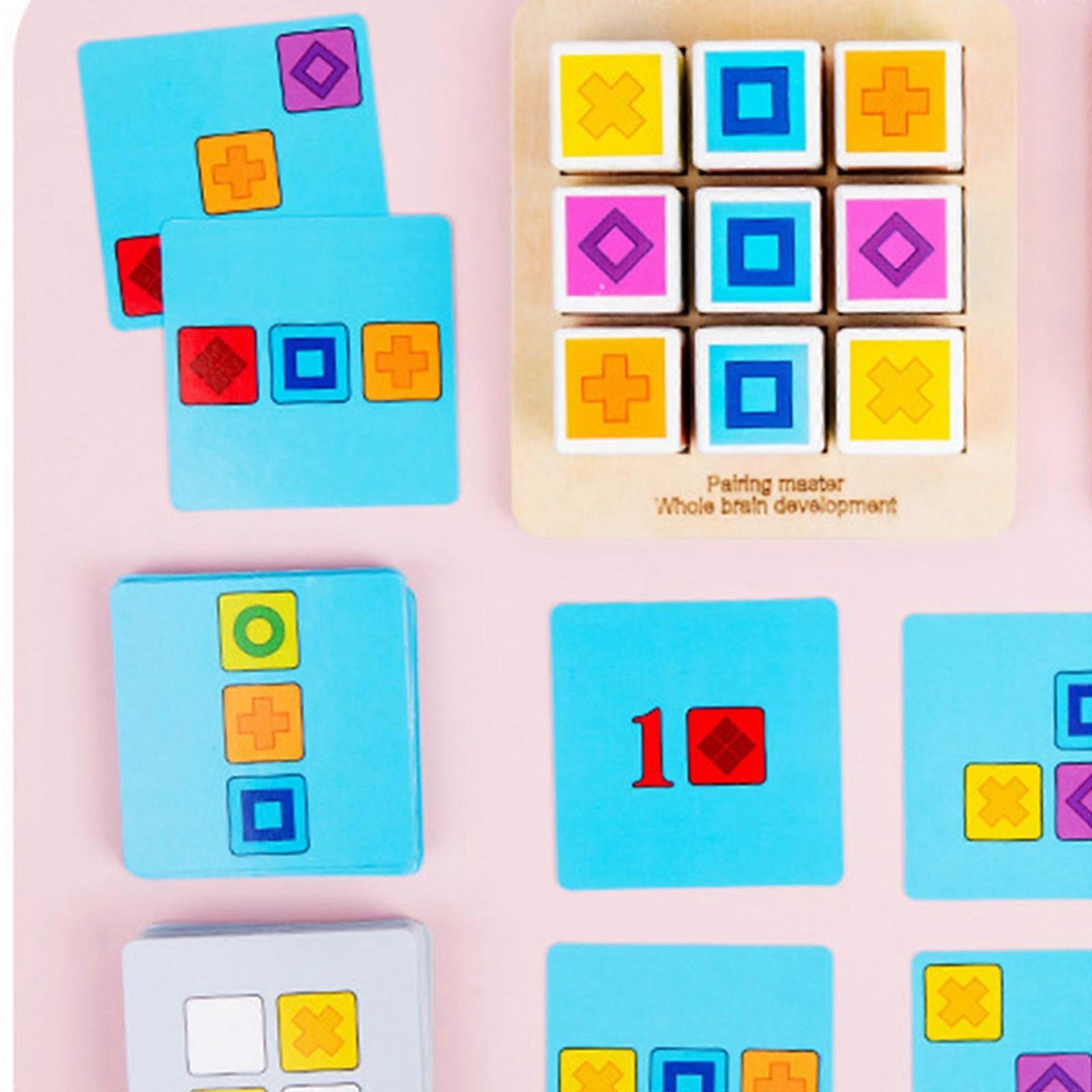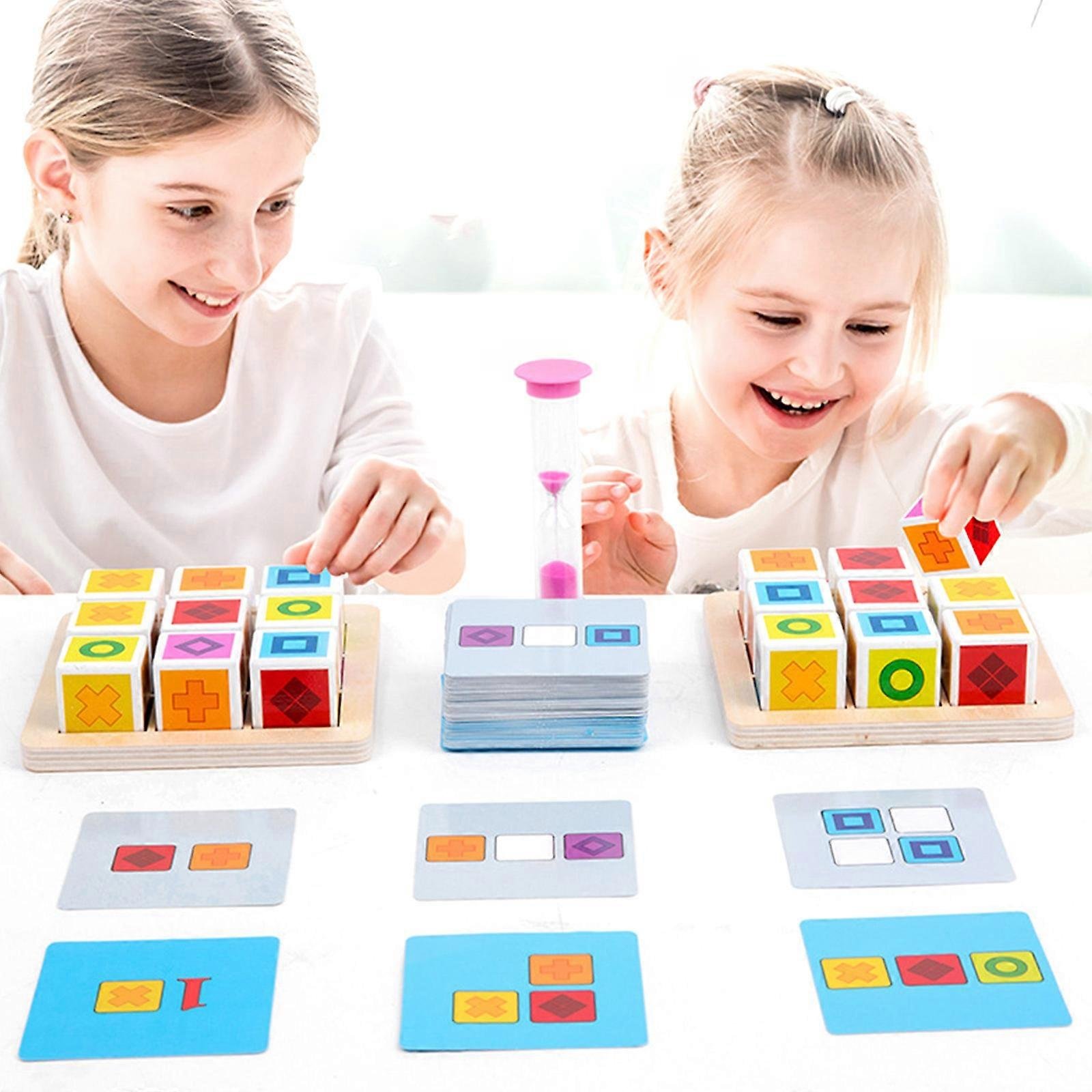 Chaque bloc présente un symbole différent, et les cartes défis indiquent les combinaisons à reproduire. L’enfant peut jouer seul, contre la montre, ou à deux pour un défi interactif.