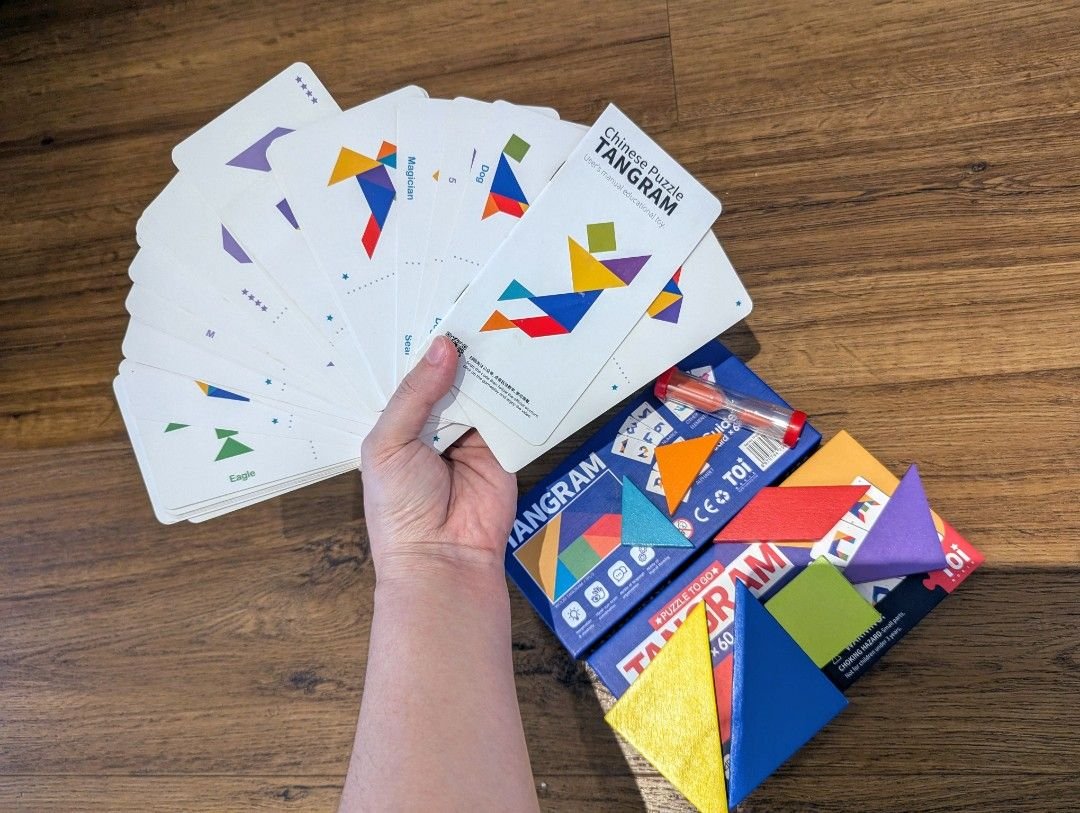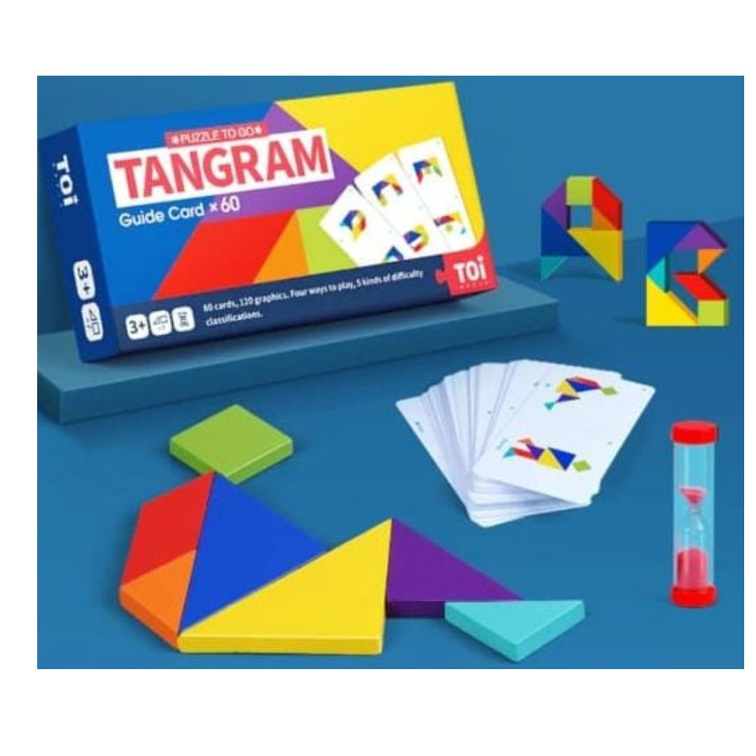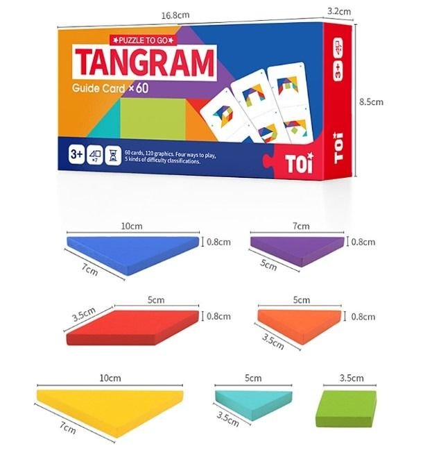 Contenu : 7 pièces de Tangram, 60 cartes modèles, 1 sablier, guide