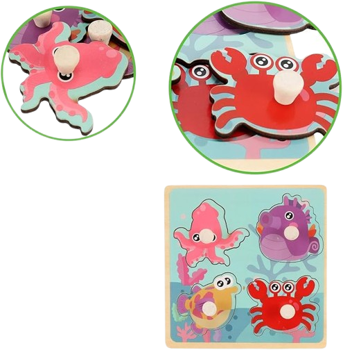Ce puzzle à boutons en bois – Animaux marins initie les tout-petits à l’univers fascinant de la mer 🌊.