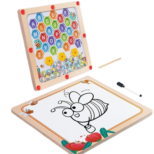 • 2-in-1 Magnetic Alphabet Maze Board – Montessori Toy for Kids – Educational board with magnetic maze and dry-erase side. Includes stylus and marker. Ideal for kids 3–5 to learn letters, colors, and coordination.